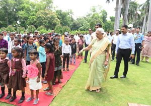 इस अवसर पर स्केटिंग करते हुए बच्चांे की अगवानी में सभी बच्चों ने छोटे लॉन से अन्नपूर्णा द्वार तक आकर्षक मार्च पास्ट किया। प्रवेशोत्सव कार्यक्रम में जनपद हरदोई के प्राथमिक विद्यालय सनफरा के बच्चों के ऊर्जस्वी प्रदर्शन की राज्यपाल ने सराहना करते हुये कहा कि छोटी उम्र में भी बहुत कुछ सीखा जा सकता है। उन्होंने बताया कि राजभवन में बच्चोें से सांस्कृतिक प्रवृतियाँ करवाई जाती हैं, उनके लिए पुस्तकालय की सुविधा है तथा परम्परागत खेल व अन्य विविध गतिविधियों में बच्चों की सक्रिय प्रतिभागिता होती है। कार्यक्रम में अपर मुख्य सचिव, राज्यपाल, डॉ0 सुधीर महादेव बोबड़े ने कहा कि यह एक ऐतिहासिक क्षण है, जब उत्तर प्रदेश के किसी विद्यालय में पहली बार प्रवेश उत्सव इस तरह से मनाया जा रहा है। इस अवसर पर जिलाधिकारी लखनऊ विशाख जी0 अय्यर, विशेष कार्याधिकारी अशोक देसाई, विशेष कार्याधिकारी (शिक्षा) डॉ0 पंकज एल0 जानी, राजभवन के अधिकारी एवं कर्मचारीगण, विद्यालय के छात्र-छात्राएं, उनके अभिभावक एवं शिक्षकगण उपस्थित रहे।